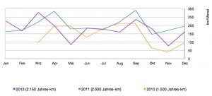 Nachzureichen ist noch die Auswertung der Jahresbilanz 2012: die Wadenverletzungen finden ihren Niederschlag in der verminderten Gesamtleistung. Aber es bleiben die Verbesserungen über die jeweiligen Streckenlängen – so mies kann es also nicht gewesen sein, das alte Jahr 2012.
